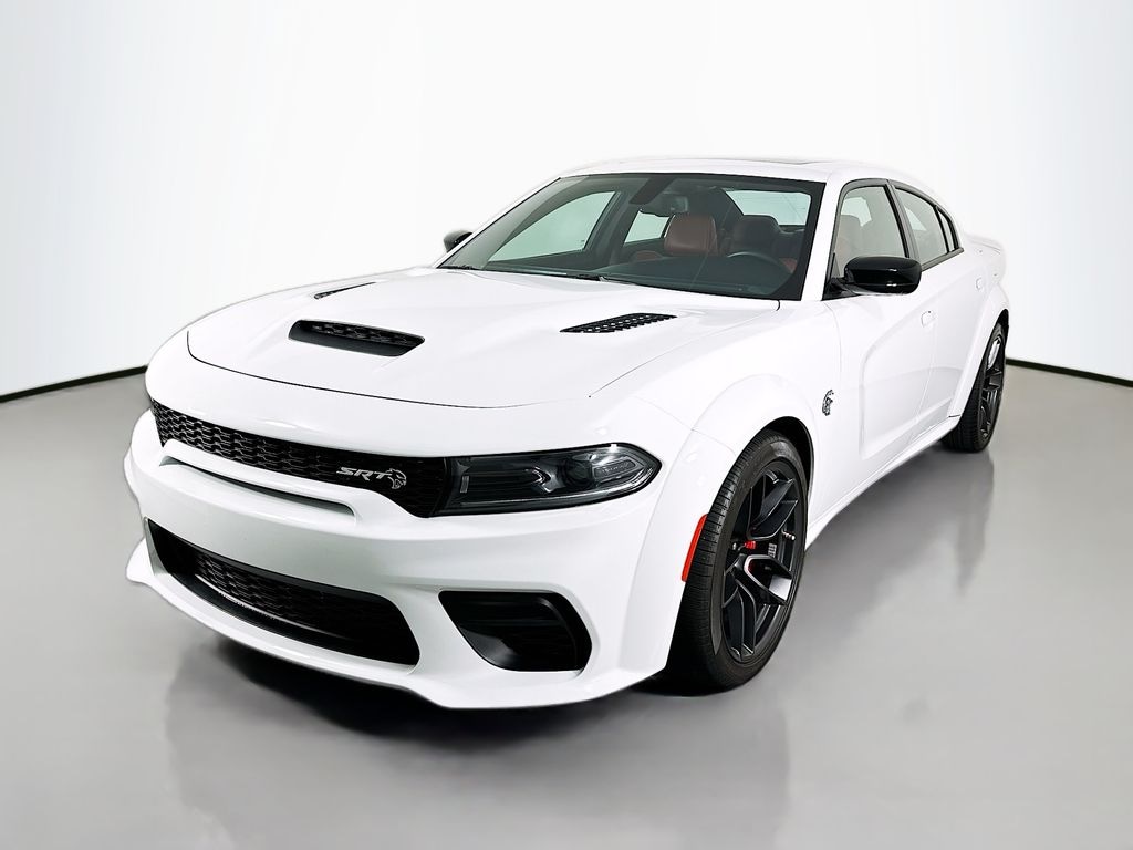 Recent Arrival! White Knuckle Clearcoat 2023 Dodge Charger SRT Hellcat Widebody 6.2L 8-Cylinder SMPI Supercharged OHV 8-Speed Automatic RWD DODGE CHARGER SRT HELLCAT WIDEBODY Exterior Color: White Knuckle Exterior Paint Interior Color: Black / Demonic Red Interior Colors Interior: Hellcat Logo Laguna Leather Seat Engine: 6.2L Supercharged HEMI® V8 SRT® Engine Transmission: 8â"Speed Automatic HP90 Transmission STANDARD EQUIPMENT (UNLESS REPLACED BY OPTIONAL EQUIPMENT) FUNCTIONAL/SAFETY FEATURES "Last Call" Underhood Plaque Biâ"Function LED Projector Headlamps Advanced SRT® Multistage Front Air Bags Supplemental Front Seatâ"Mounted Side Air Bags Supplemental Sideâ"Curtain Front and Rear Air Bags Active Head Restraints Deluxe Security Alarm Sentry Key® Theft Deterrent System ParkSense® Rear Parkâ"Assist System ParkView® Rear Backâ"Up Camera Dodge Clean Air System Widebody Competition Suspension 2.62 Rear Axle Ratio Line Lock Launch Control Afterâ"Run Chiller Launch Assist Antiâ"Spin Differential Rear Axle Brembo® 6â"Piston Fixed Front Caliper Brakes Red Brake Calipers Adaptive Damping Suspension SRT® Configurable Drive Modes Performance Shiftâ"Indicator Remoteâ"Start System Blindâ"Spot and Crossâ"Path Detection Radford Track Experience â" Dodgegarage.com/SRT INTERIOR FEATURES 200â"MPH Primary Speedometer SRT® Performance Pages Uconnect® 4C with 8.4â"Inch Touch Screen Display SiriusXM® with 6â"Month Radio Sub Call 800â"643â"2112 SiriusXM GuardianTM Connected Services w/ 1â"Yr Trial 4G LTE Wiâ"Fi Hot Spot Apple CarPlay® Google Android AutoTM 6 Premium Alpine® Speakers 276â"Watt Amplifier Power Front Driver and Passenger Seats Heated Front Seats Ventilated Front Seats Heated Secondâ"Row Seats Memory for Radio, Driver Seat and Exterior Mirrors SRT® Leather Steering Wheel with Red LED Logo Steeringâ"Wheelâ"Mounted Shift Control Heated Steering Wheel EXTERIOR FEATURES 20â"Inch x 11.0â"Inch Devil's Rim Granite Wheels 305/35ZR20 (107Y) Allâ"Season Performance Tires Single Scoop SRT® Hood with Air Intake SRT® Performance Spoiler OPTIONAL EQUIPMENT (May Replace Standard Equipment) Customer Preferred Package 23B $995 Dual Bright Exhaust Tips "Jailbreak" Instrument Panel Badge Navigation & Travel Group $995 GPS Navigation SiriusXM® Travel Link with 5â"Year Subscription SiriusXM® Traffic Plus with 5â"Year Subscription Uconnect® 4C NAV with 8.4â"Inch Touch Screen Display Harman Kardon® Audio Group $1,995 19 Harman Kardon® GreenEdge® Speakers Harman Kardon® GreenEdge® Amplifier Surround Sound Black / Demonic Red Seats $395 Demonic Red Seat Belts $395 Suede Headliner $499 Power Sunroof $1,995 Real Carbon Fiber Interior Accents $599 Gas Guzzler Tax $2,10, Demonic Red/Black Leather, ABS brakes, Alloy wheels, Compass, Electronic Stability Control, Front dual zone A/C, Heated door mirrors, Heated Front Seats, Heated front seats, Heated rear seats, Illuminated entry, Low tire pressure warning, ParkView Rear Back-Up Camera, Passenger door bin, Remote keyless entry, Traction control.